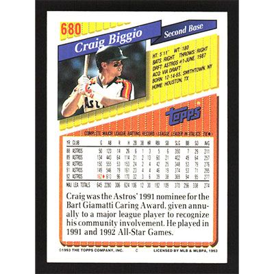 This is a 1993 Topps Craig Biggio baseball card. The card is #680 and pictures show condition.