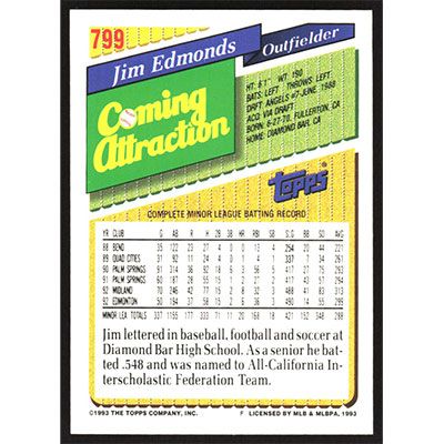 This is a 1993 Topps Gold Jim Edmonds Coming Attraction baseball card. The card is #799 and pictures show condition.