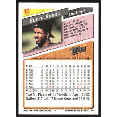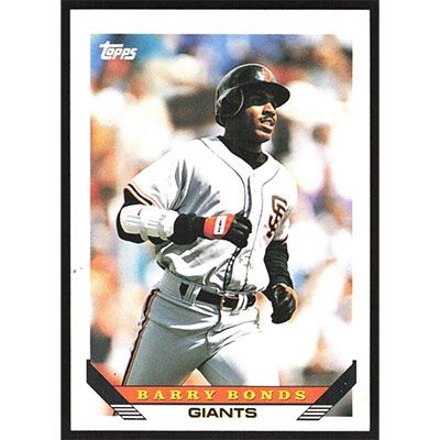 This is a 1993 Topps Traded Barry Bonds baseball card. The card is #1T and pictures show condition.