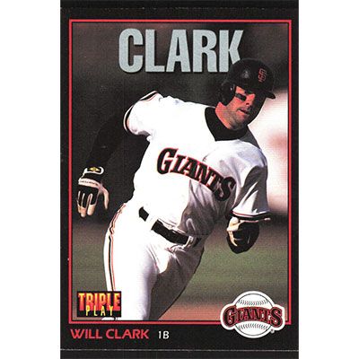 This is a 1993 Triple Play Will Clark baseball card. The card is #107 and pictures show condition.