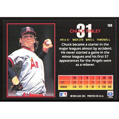 This is a 1993 Triple Play Chuck Finley baseball card. The card is #169 and pictures show condition.