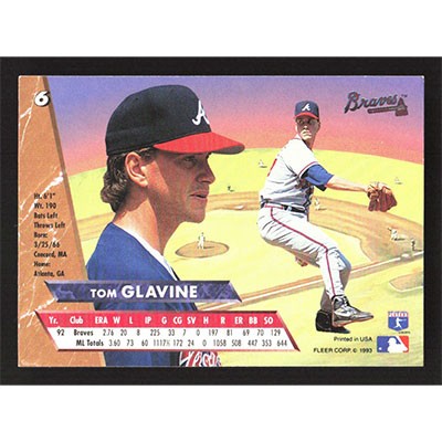 This is a 1993 Ultra Tom Glavine baseball card. The card is #6 and pictures show condition.