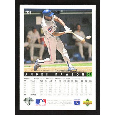 This is a 1993 Upper Deck Andre Dawson baseball card. The card is #308 and pictures show condition.