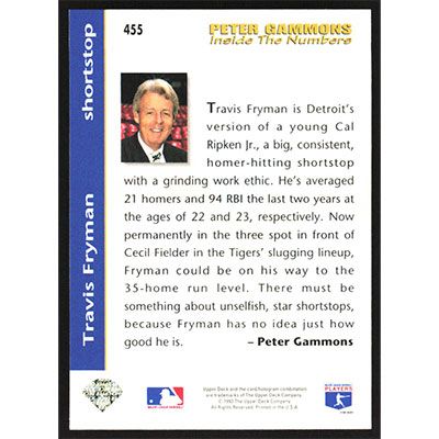 This is a 1993 Upper Deck Travis Fryman Inside the Numbers baseball card. The card is #455 and pictures show condition.