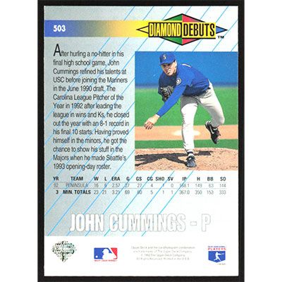 This is a 1993 Upper Deck John Cummings Diamond Debuts baseball card. The card is #503 and pictures show condition. Team(s): Seattle Mariners Rookie Card (RC)