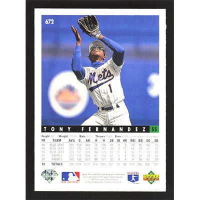 This is a 1993 Upper Deck Tony Fernandez baseball card. The card is #672 and pictures show condition.