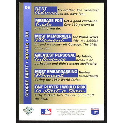 This is a 1993 Upper Deck On Deck George Brett baseball card. The card is #D6 and pictures show condition.