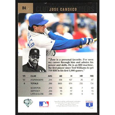 This is a 1993 Upper Deck Reggie Jackson's Clutch Performers Jose Canseco baseball card. The card is #R4 and pictures show condition. Team(s): Texas Rangers
