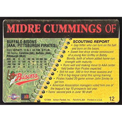 This is a 1994 Action Packed Midre Cummings baseball card. The card is #12 and pictures show condition.