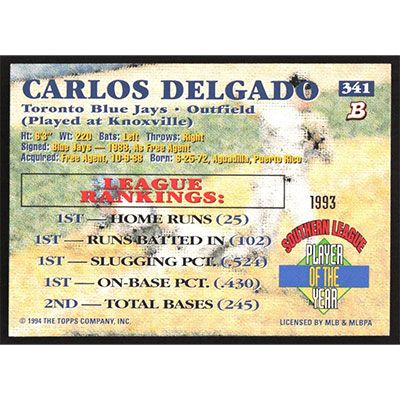 This is a 1994 Bowman Carlos Delgado Foil baseball card. The card is #341 and pictures show condition.