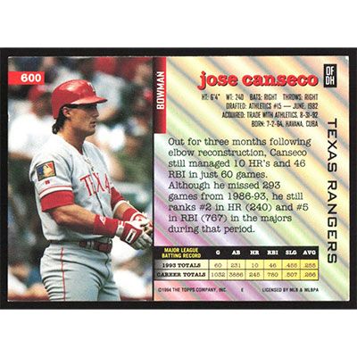 This is a 1994 Bowman Jose Canseco baseball card. The card is #600 and pictures show condition.