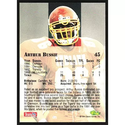 This is a 1994 Classic Arthur Bussie NFL Draft football card. The card is #45 and pictures show condition.