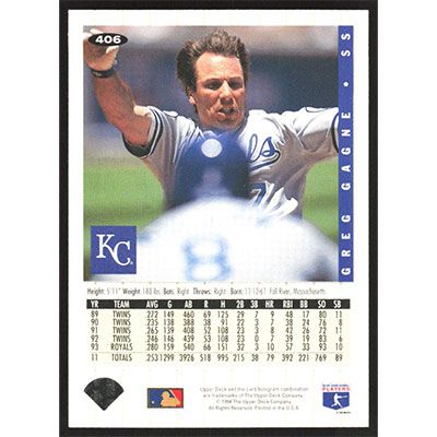This is a 1994 Collector's Choice Greg Gagne baseball card. The card is #406 and pictures show condition.
