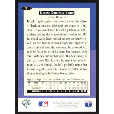 This is a 1994 Collector's Choice Steve Dreyer Rookie Class baseball card. The card is #5 and pictures show condition. Team(s): Texas Rangers Rookie Card (RC)