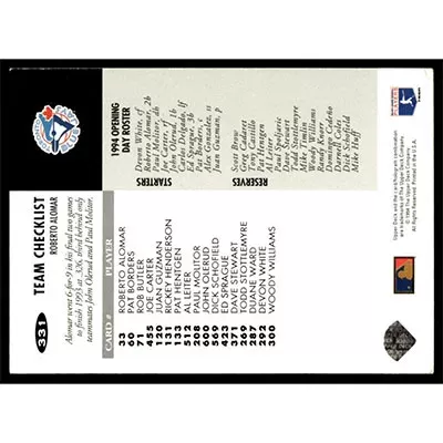 This is a 1994 Collector's Choice Silver Signature Roberto Alomar Team Checklist baseball card. The card is #331 and pictures show condition. Team(s): Toronto Blue Jays