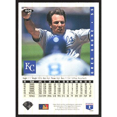 This is a 1994 Collector's Choice Silver Signature Greg Gagne baseball card. The card is #406 and pictures show condition.