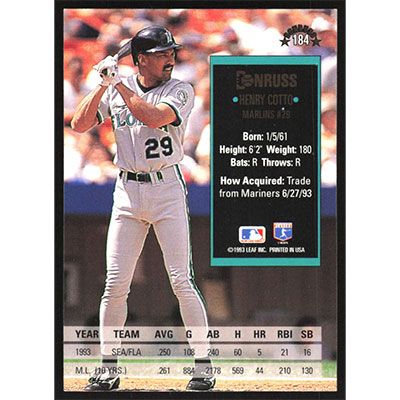 This is a 1994 Donruss Henry Cotto baseball card. The card is #184 and pictures show condition.