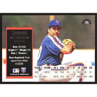 This is a 1994 Donruss Sid Fernandez baseball card. The card is #396 and pictures show condition.