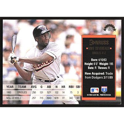 This is a 1994 Donruss Mike Devereaux baseball card. The card is #69 and pictures show condition.