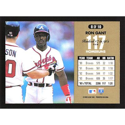 This is a 1994 Donruss 90's Dominators Homeruns Ron Gant baseball card. The card is #8 and pictures show condition.