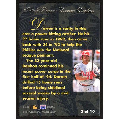 This is a 1994 Flair Infield Power Darren Daulton baseball card. The card is #3 and pictures show condition.