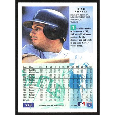 This is a 1994 Fleer Rich Amaral baseball card. The card is #278 and pictures show condition.
