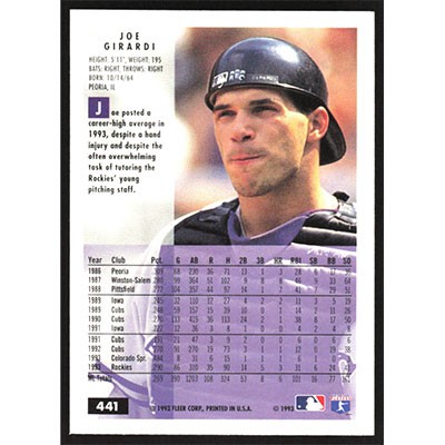 This is a 1994 Fleer Joe Girardi baseball card. The card is #441 and pictures show condition.