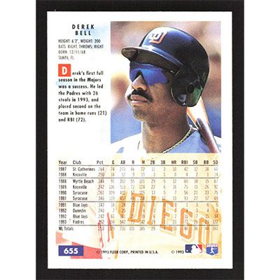 This is a 1994 Fleer Derek Bell baseball card. The card is #655 and pictures show condition.