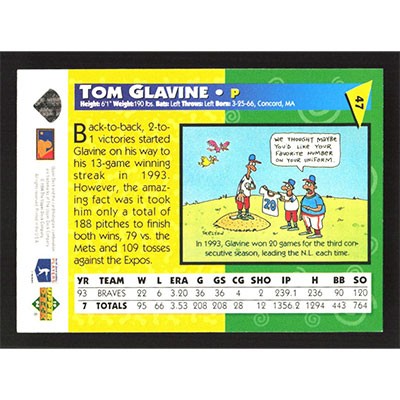 This is a 1994 Fun Pack Tom Glavine baseball card. The card is #47 and pictures show condition.