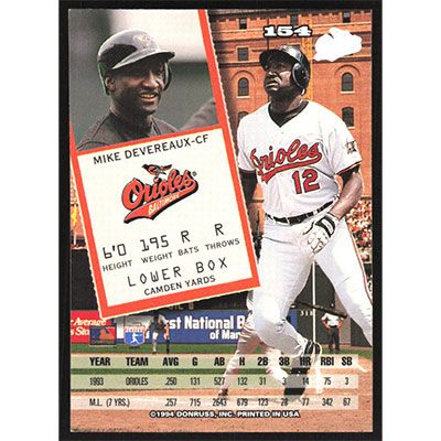 This is a 1994 Leaf Mike Devereaux baseball card. The card is #154 and pictures show condition.