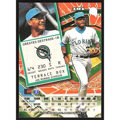 This is a 1994 Leaf Orestes Destrade autographed baseball card. This card has been signed, in blue, by Orestes Destrade, and is guaranteed authentic by Ballcardz.com. The card is #191 and pictures show condition.