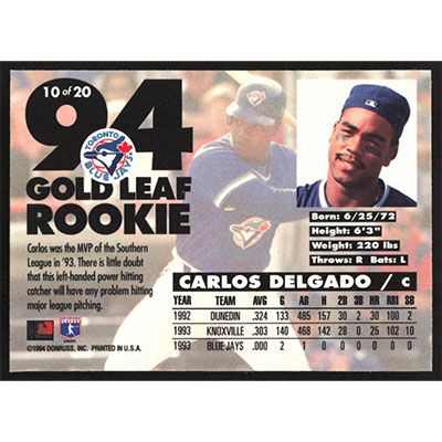 This is a 1994 Leaf Gold Rookies Carlos Delgado baseball card. The card is #10 and pictures show condition.