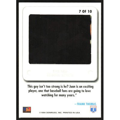 This is a 1994 Leaf Slideshow Juan Gonzalez baseball card. The card is #7 and pictures show condition.