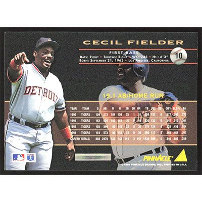 This is a 1994 Pinnacle Cecil Fielder baseball card. The card is #10 and pictures show condition.