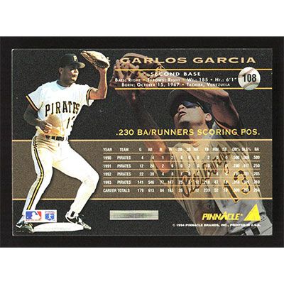 This is a 1994 Pinnacle Carlos Garcia baseball card. The card is #108 and pictures show condition.