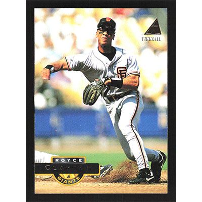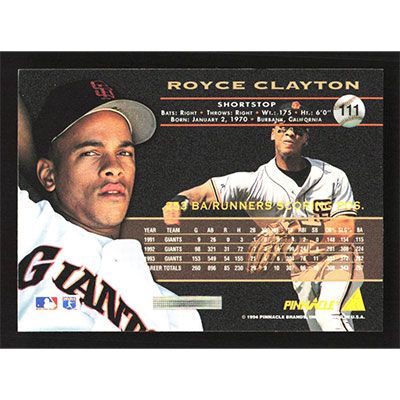 This is a 1994 Pinnacle Royce Clayton baseball card. The card is #111 and pictures show condition.