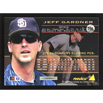 This is a 1994 Pinnacle Jeff Gardner baseball card. The card is #296 and pictures show condition.