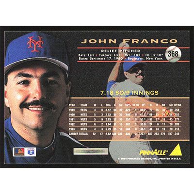 This is a 1994 Pinnacle John Franco baseball card. The card is #368 and pictures show condition.