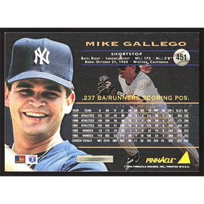 This is a 1994 Pinnacle Mike Gallego baseball card. The card is #451 and pictures show condition.