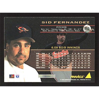 This is a 1994 Pinnacle Sid Fernandez baseball card. The card is #483 and pictures show condition.