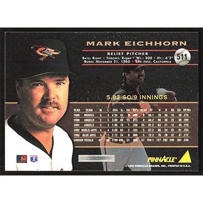 This is a 1994 Pinnacle Mark Eichhorn baseball card. The card is #511 and pictures show condition.
