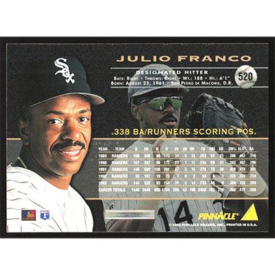This is a 1994 Pinnacle Julio Franco autographed baseball card. This card has been signed, in blue, by Julio Franco, and is guaranteed authentic by Ballcardz.com. The card is #520 and pictures show condition.