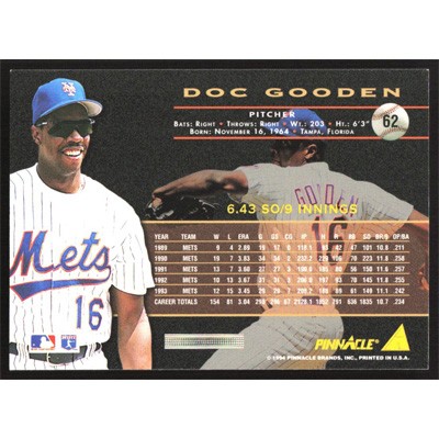 This is a 1994 Pinnacle Doc Gooden baseball card. The card is #62 and pictures show condition.
