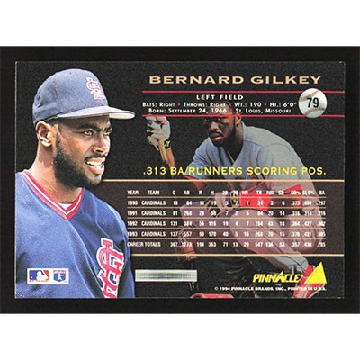 This is a 1994 Pinnacle Bernard Gilkey baseball card. The card is #79 and pictures show condition.