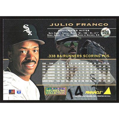 This is a 1994 Pinnacle Museum Collection Julio Franco baseball card. The card is #520 and pictures show condition.