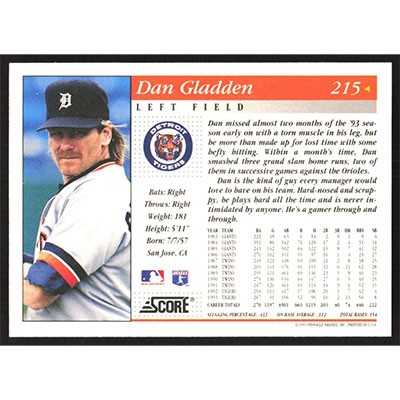This is a 1994 Score Dan Gladden baseball card. The card is #215 and pictures show condition.