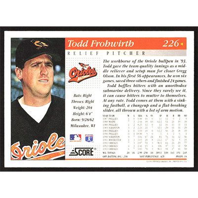This is a 1994 Score Todd Frohwirth baseball card. The card is #226 and pictures show condition.