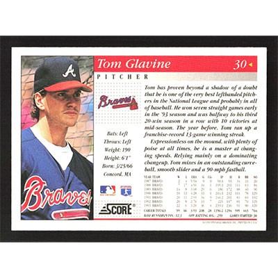 This is a 1994 Score Tom Glavine baseball card. The card is #30 and pictures show condition.