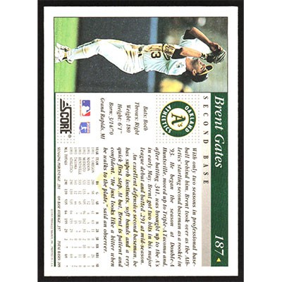 This is a 1994 Score Gold Rush Brent Gates baseball card. The card is #187 and pictures show condition.