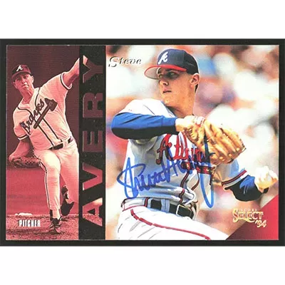 This is a 1994 Select Steve Avery baseball card. This card has been signed, in blue, by Steve Avery, and is guaranteed authentic by Ballcardz.com. The card is #87 and pictures show condition.